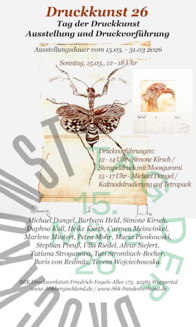 Was kommt:15. - 31. März 2026 Die Ausstellung zeigt die Vielfalt der druckgrafischen Techniken, deren sich 17 Künstler:innen der Projektgruppe Druckgrafik des BBK Bergisch Land bedienen: Besichtigung nach Absprache 08. März - 19. April 2026 sag mir wo KUNSTKIEZ langer Donnerstag Die Ausstellung öffnet donnertags von 17.00-19.00: Was war:Kunst & Konzert in der Musikapotheke Finissage Druckkunst Ausstellung TRANSIT Sept u Okt 2025 BBK Druckwerkstatt Wuppertal-Unterbarmen wie?gedruckt - Druckkunst im Austausch Grafikgruppe Bamberg & Veranstaltungsreihe: 05./06. - 14. Oktober 2024 01. - 31.Dezember 2024